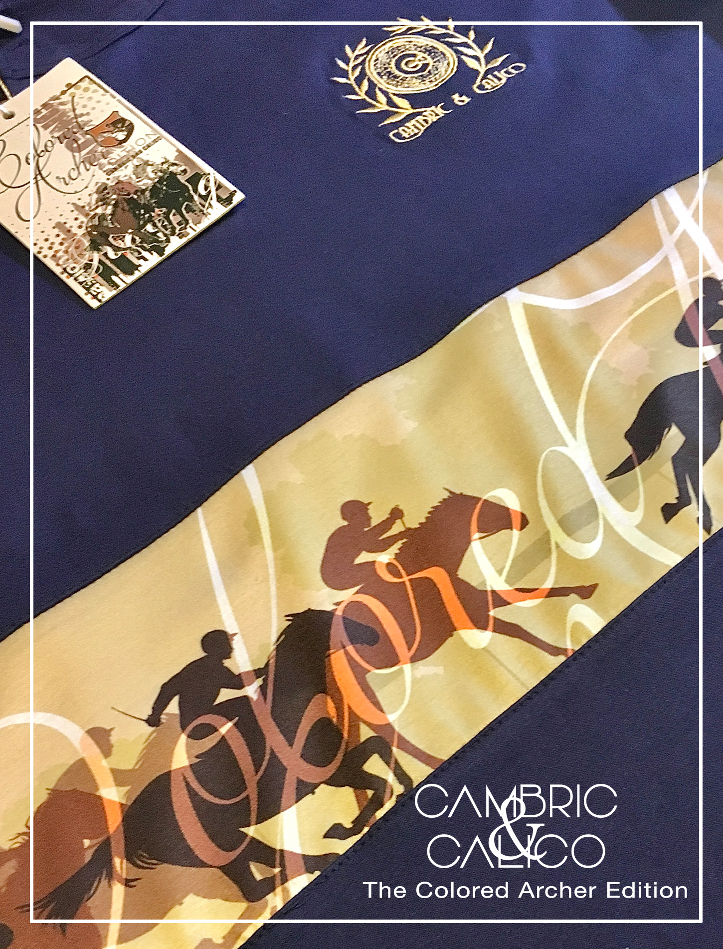 The Colored Archer horse racing stripe long sleeve was designed to capture the last stretch to the finish. This shirt contains wooden buttons and a full wrap around stripe with horses and jockeys heading to the finish line.